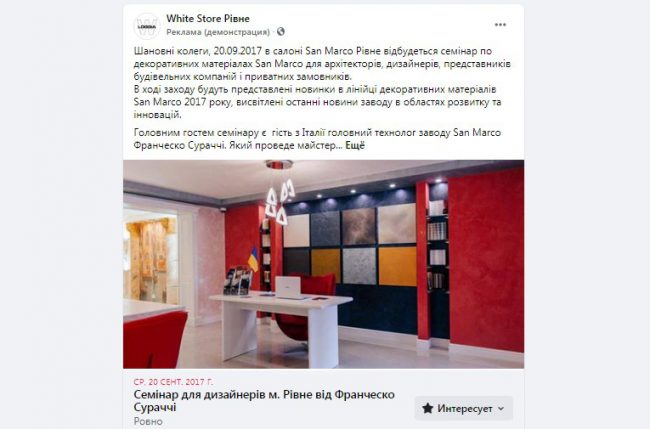 Реклама події в фейсбук для салону декоративних матеріалів, фарб та штукатурок в м. Рівне, націлена на декораторів.